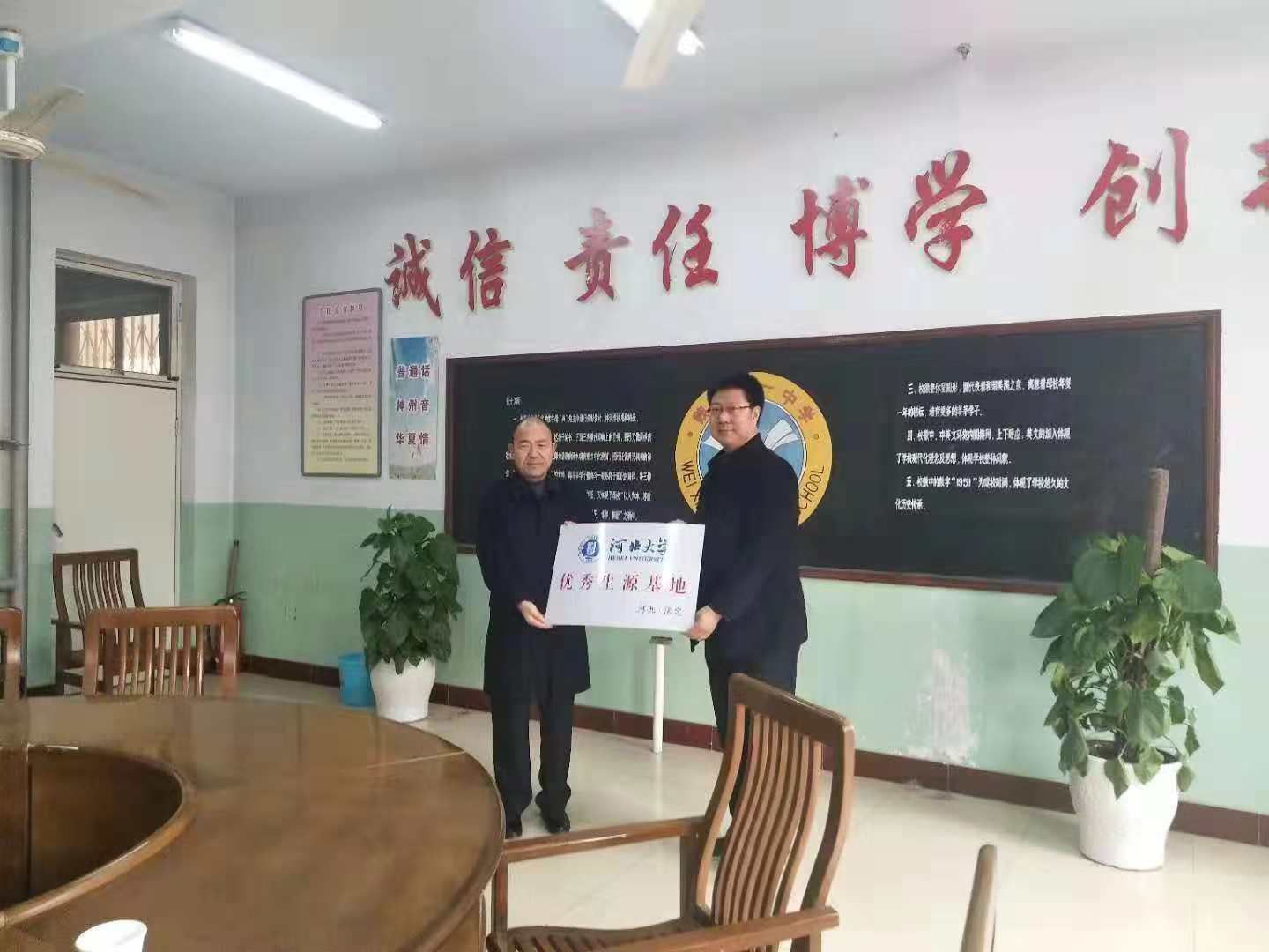 根据《关于启动第四批优秀生源基地建设工作的通知》有关要求,结合学校“一省一院一师一县计划”,2018年11月29日至30日,经济学院副院长尹成远教授一行先后到邯郸市永年区第一中学与魏县第一中学,开展招生宣传并举行“河北大学优秀生源基地”挂牌仪式。
