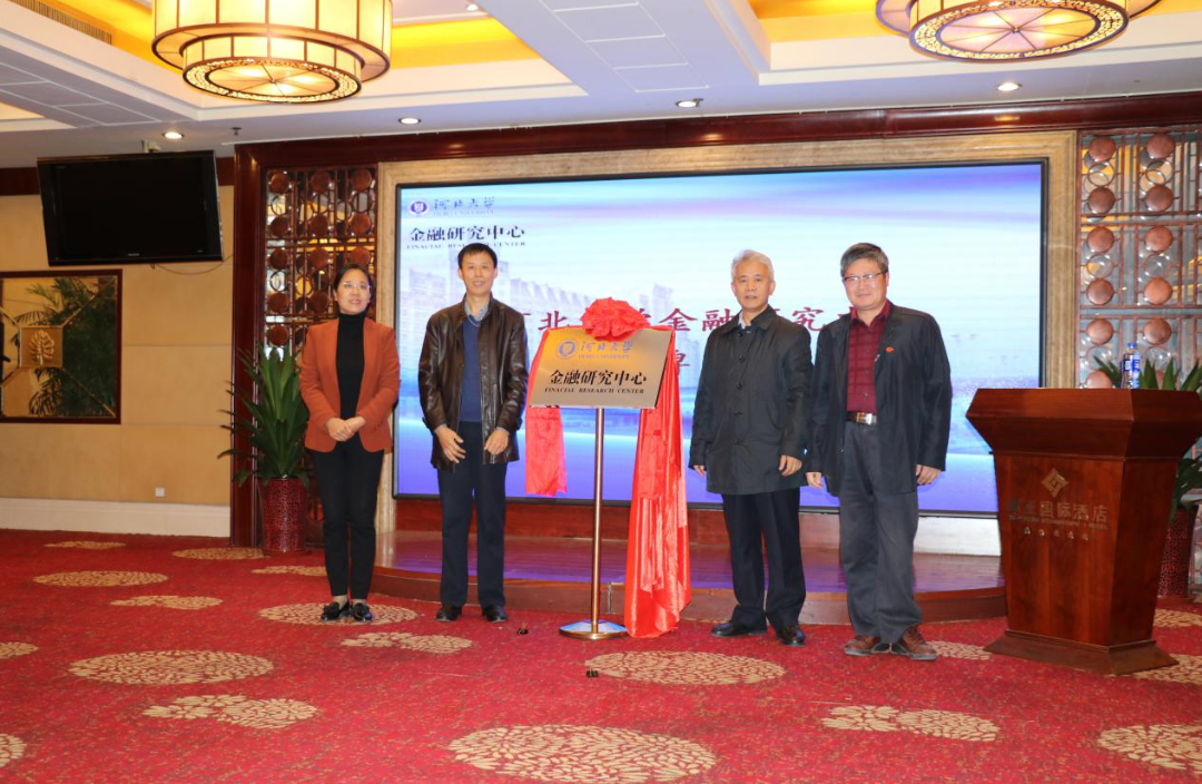 首先,河北大学党委常委、副校长康书生致辞,他充分肯定了本次论坛的重要意义,希望与会领导们能够进行充分的交流,为助力保定金融发展提出有针对性的政策建议,指出“河北大学金融研究中心”的成立,可以提升河北大学经济金融学科水平,及时跟踪现在金融理论前沿,促进产、学、研等部门的进一步交流与合作。其次,中国人民银行保定市中心支行副行长陈立方,河北省银监局保定分局副局长牛惠君、河北大学党委常委、副校长康书生、经济学院院长王金营为“河北大学金融研究中心”揭牌。